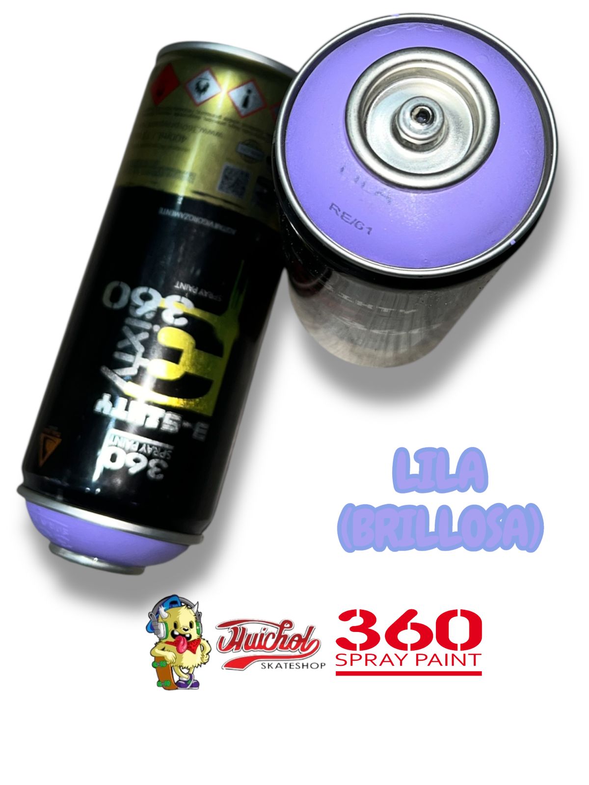 La 360 Spray Paint Color Lila Brillosa 400ml ofrece un delicado tono violeta claro con acabado brillante, ideal para degradados, ilustración urbana, murales y proyectos de diseño.