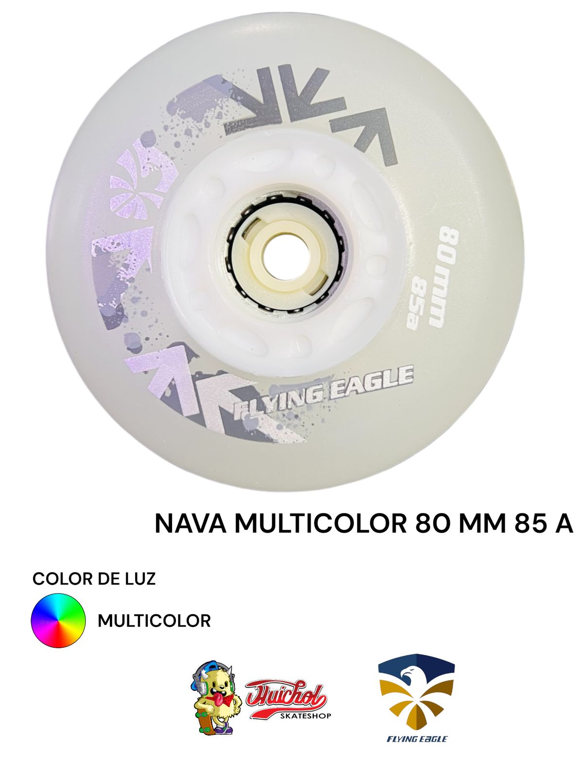 Llantas Flying Eagle Nava 80mm 85A con luces multicolor, ideales para patinaje urbano con estilo y visibilidad nocturna.