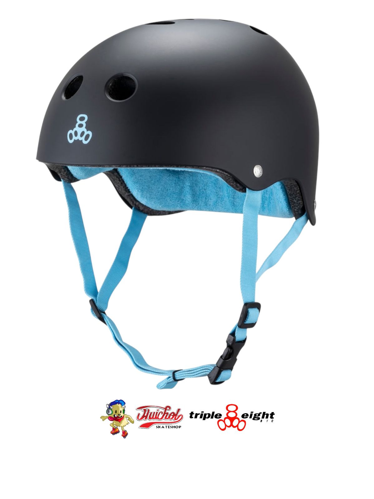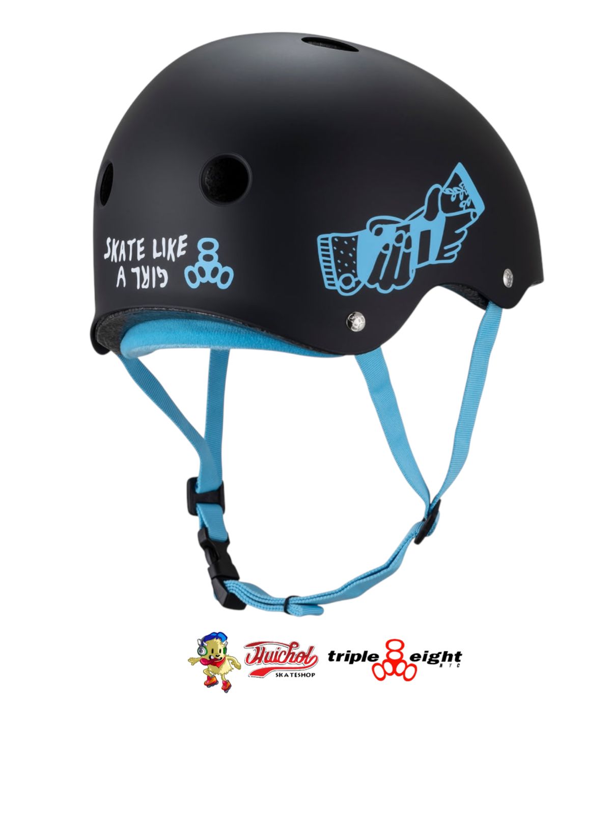 Casco Triple Eight “Skate Like a Girl” en color negro con interior azul, diseñado para patinadores que buscan la mejor protección con estilo y comodidad.