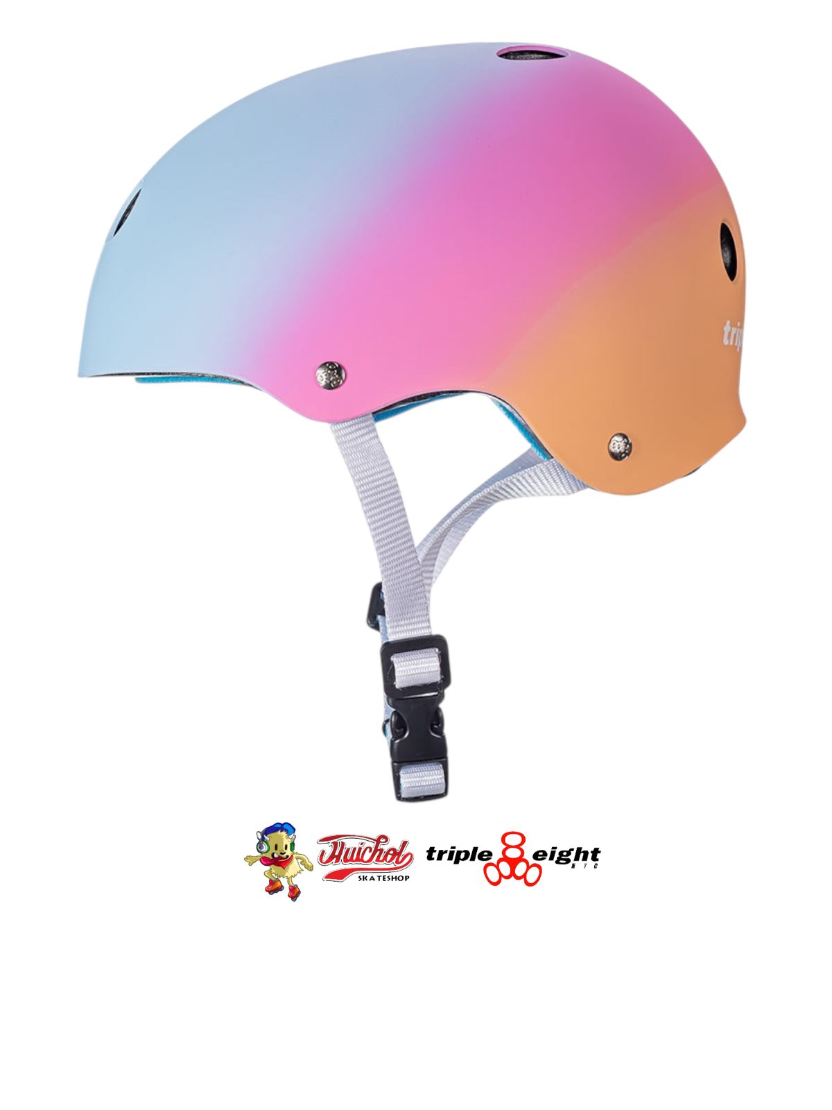 Casco Triple Eight Sunset con diseño degradado azul y rosa, comodidad Sweatsaver™ y certificación profesional para máxima protección