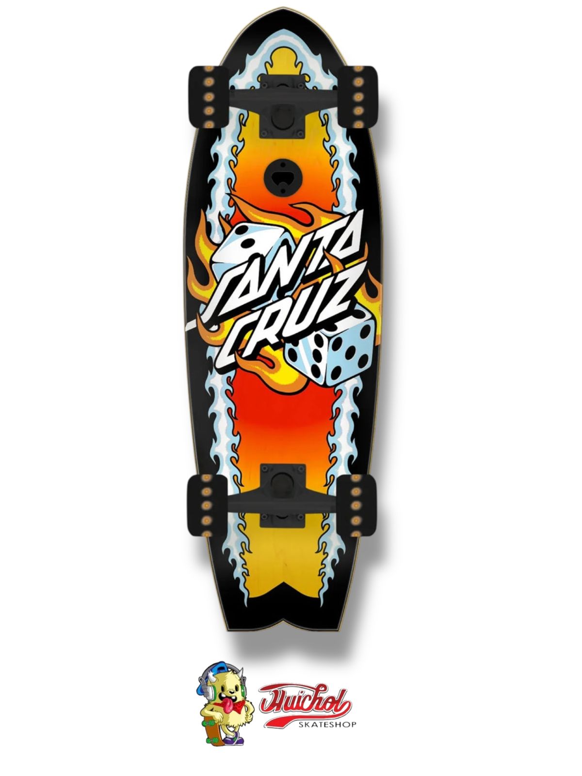 El skate completo Santa Cruz Flaming Dice Don’t Shark combina el ADN clásico del skateboarding con un diseño agresivo y llamativo. Su gráfico central de dados en llamas sobre fondo degradado rojo, naranja y amarillo transmite pura velocidad y actitud, acompañado del icónico logo Santa Cruz en gran formato.