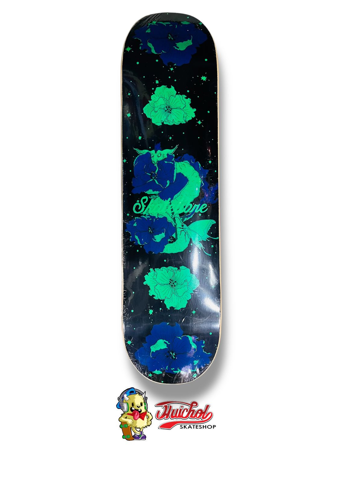 Explora el universo sobre ruedas con la Tabla Skate Libre Flores 8.0″, una tabla que mezcla arte floral y fantasía cósmica. Su gráfico muestra flores en tonos azul y verde neón flotando entre estrellas, con una criatura mitológica al centro que parece surgir de un sueño psicodélico.