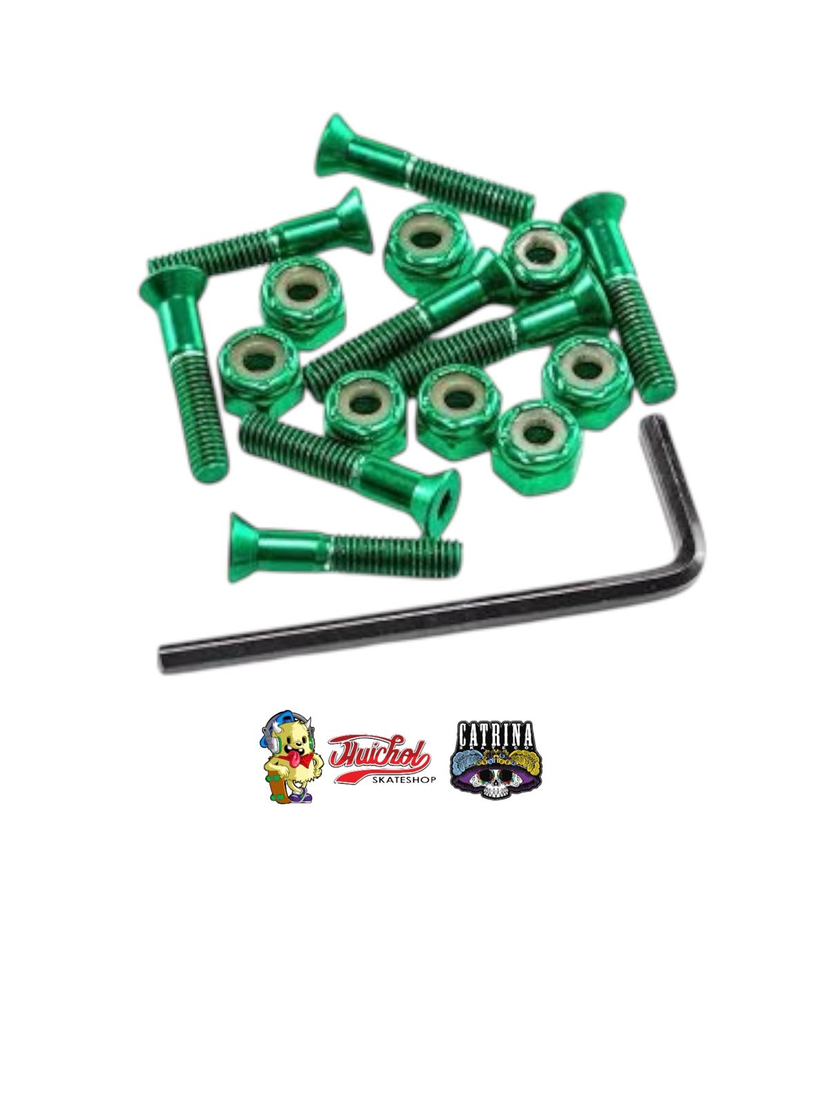 Tornillos Catrina verdes con llave Allen. Fabricados en acero anodizado de alta resistencia para un estilo llamativo y funcional.