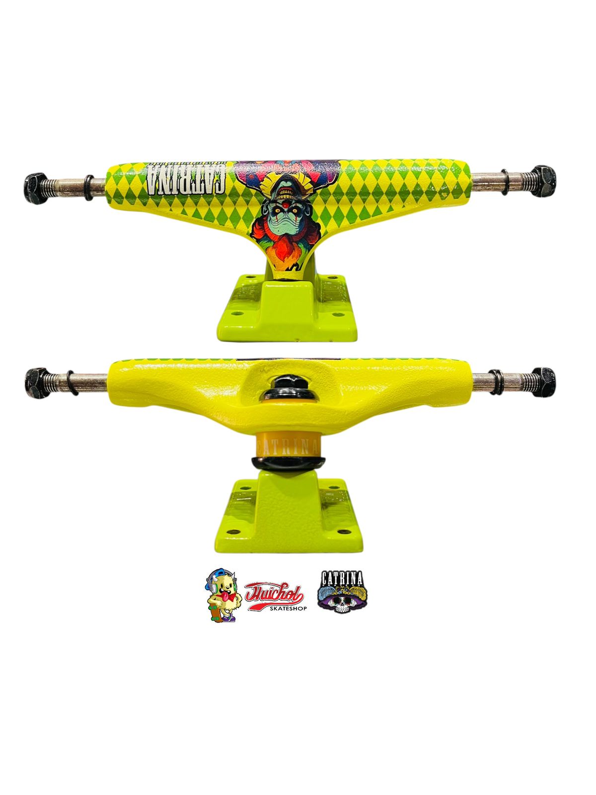 Los Catrina Evil Clown 146mm son trucks que no pasan desapercibidos. Su hanger amarillo fluorescente luce un gráfico de payaso siniestro con detalles en rojo, verde y morado, acompañado de un patrón de rombos en verde que potencia su carácter llamativo. La base metálica amarilla refuerza el diseño explosivo y diferente de este modelo.