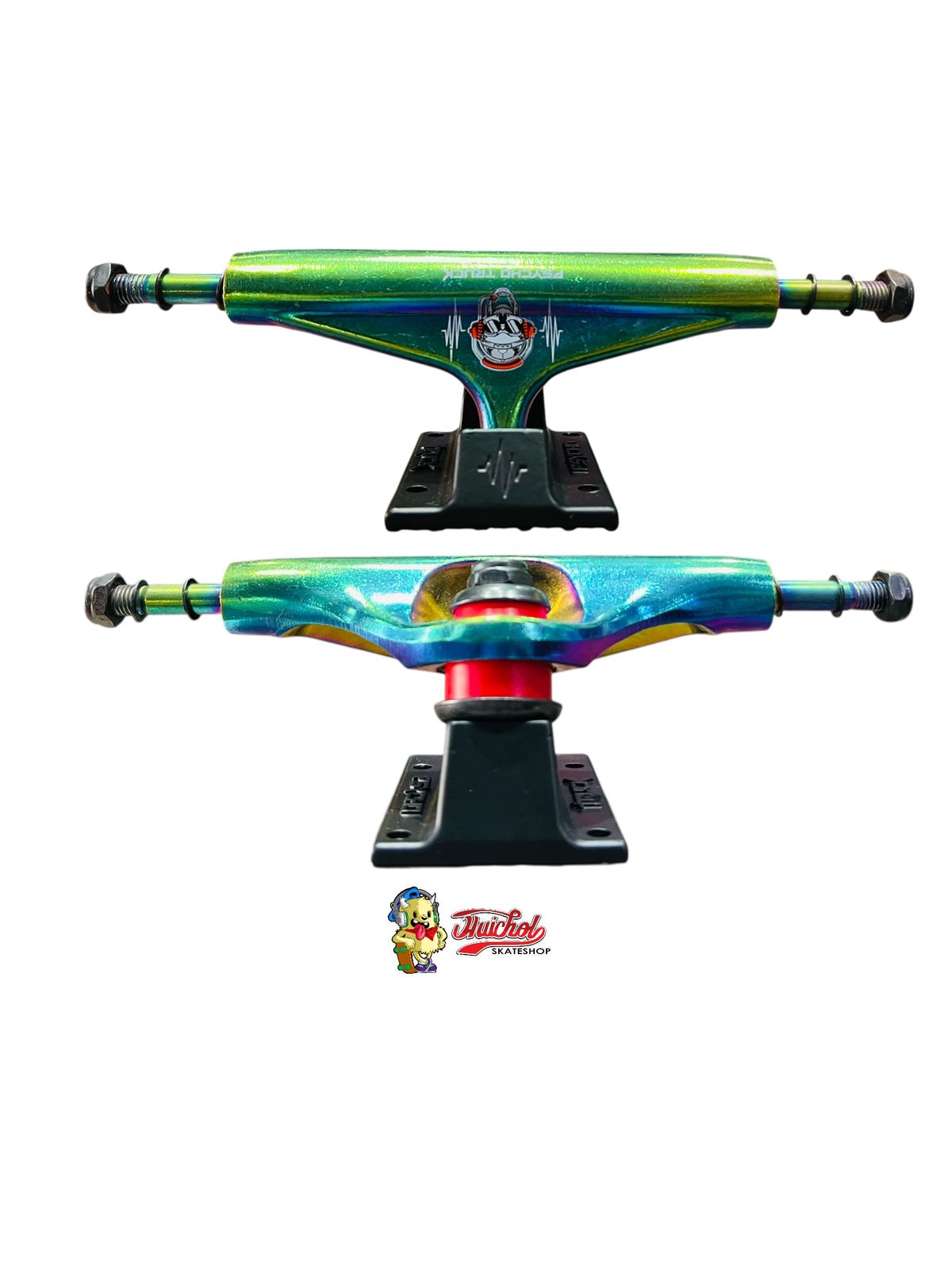 El Truck Psycho Monkey Tournasol Lemon Green 139 mm combina diseño tornasol en verde limón con un rendimiento excepcional en la tabla. Fabricado con materiales de alta resistencia, ofrece durabilidad, estabilidad y giros precisos, ideales para riders que buscan destacar en parques, calles o bowls. Su acabado brillante no solo aporta un look llamativo, sino que garantiza una mayor protección contra desgaste. Perfecto para quienes buscan trucks de 139 mm con estilo único y calidad profesional.