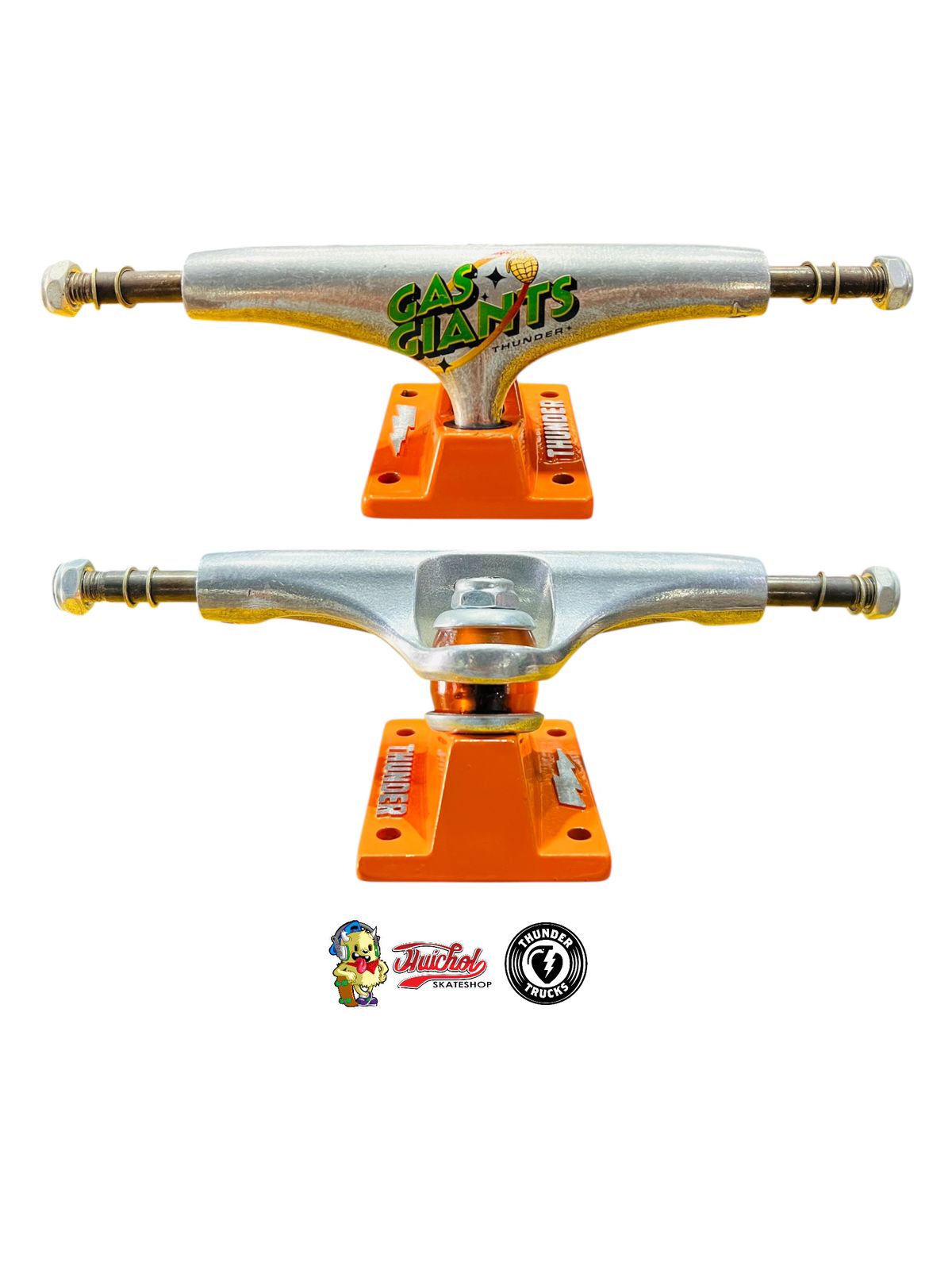 Los Thunder Griffin Gass Giant 139mm son un pro model diseñado en colaboración con el rider Griffin Gass, combinando el rendimiento legendario de Thunder con un look único y llamativo. Su hanger pulido con gráfico “Gas Giants” y la base naranja vibrante aportan un estilo fresco y lleno de energía a tu patineta.